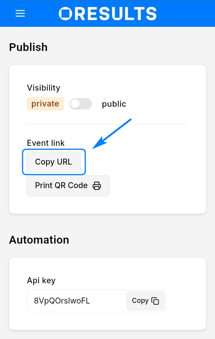 Api keya čísloportvýsledkové služby, jméno akce se ukáže ihned po vložení api key. Nebo použijCopy URL, která automaticky nastaví api key po otevření aplikace