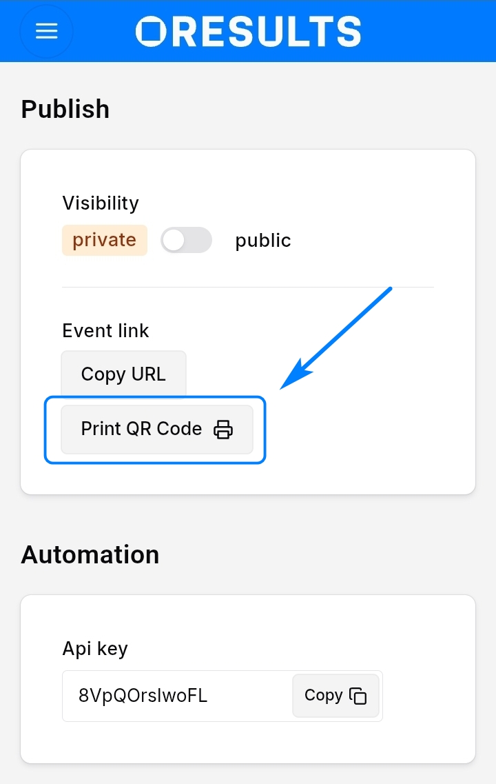 - využij přímé možnosti tisku QR kódu s odkazem na Tvůj závod nebo kód přidej na web závodu